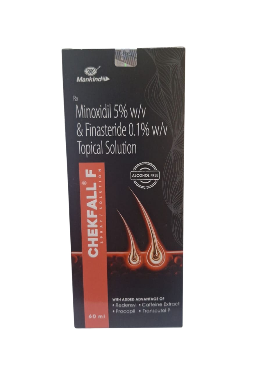 Chekfall-F 5% Topical Solution is a medication combining minoxidil (5%) and finasteride (0.1%), which is. It treats male pattern baldness by stimulating hair regrowth and preventing further hair loss.