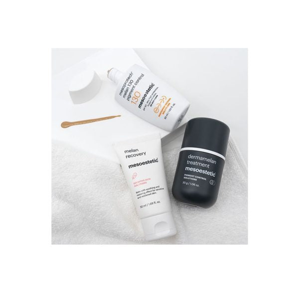 • Mesoestetic melan recovery solution with active ingredients, bisabolol, rhodosorus marinus extract, shea butter, niacinamide.