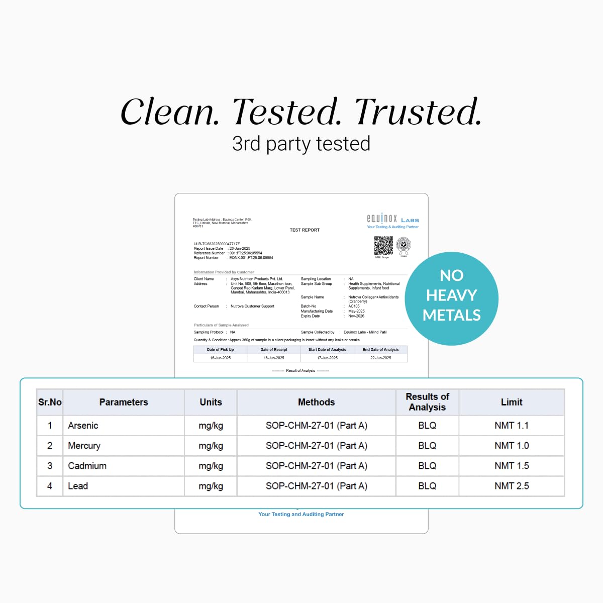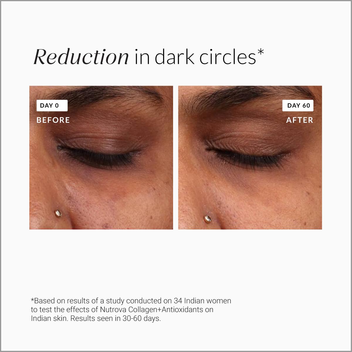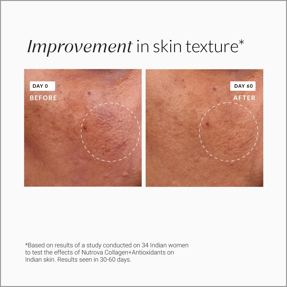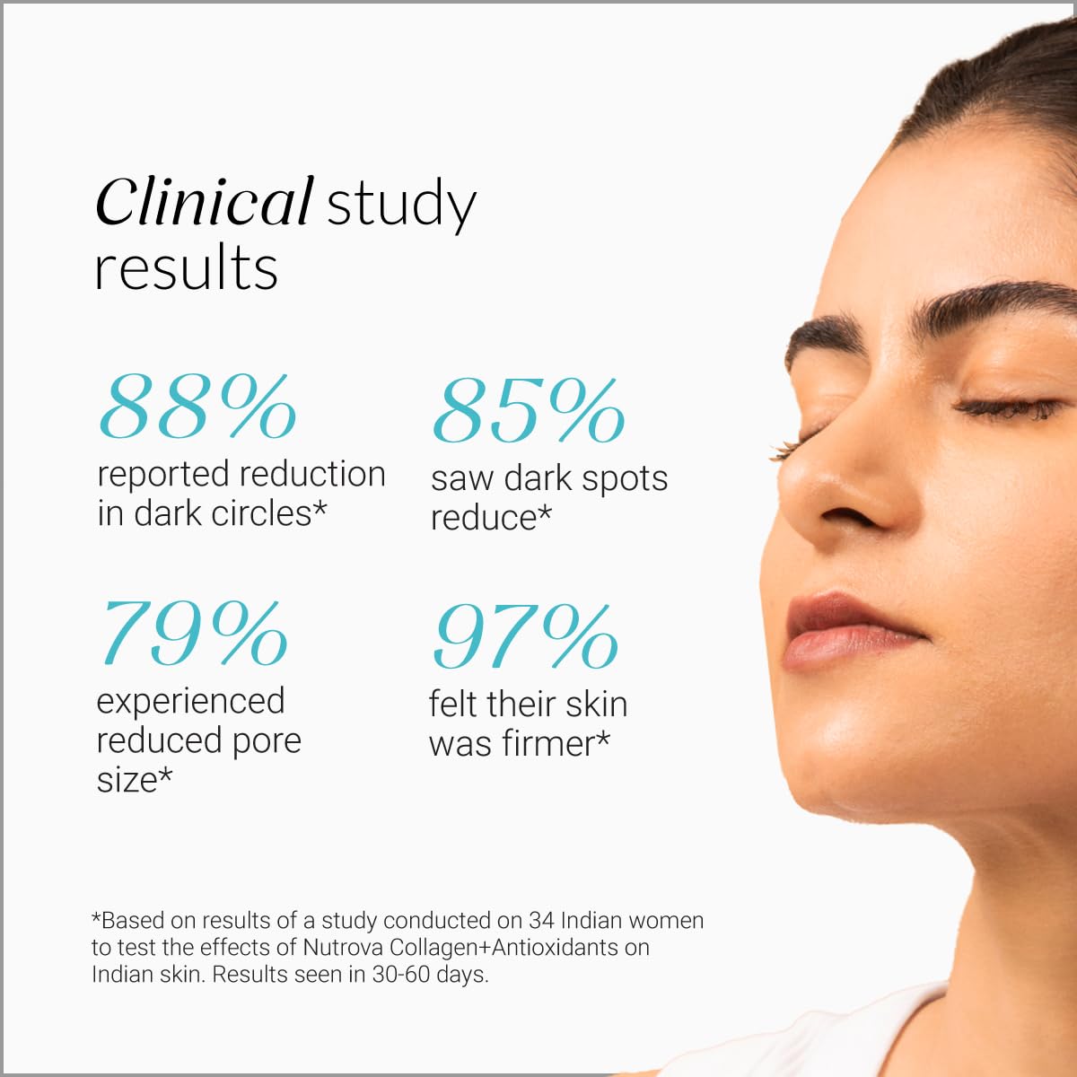 CLINICALLY TESTED ON INDIAN SKIN: In a first-of-its-kind clinical study on Indian women, Nutrova Collagen+Antioxidants has shown to improve skin elasticity, hydration and texture. It also reduced under-eye dark circles, skin dullness, wrinkles, pigmentation spots and pore size.