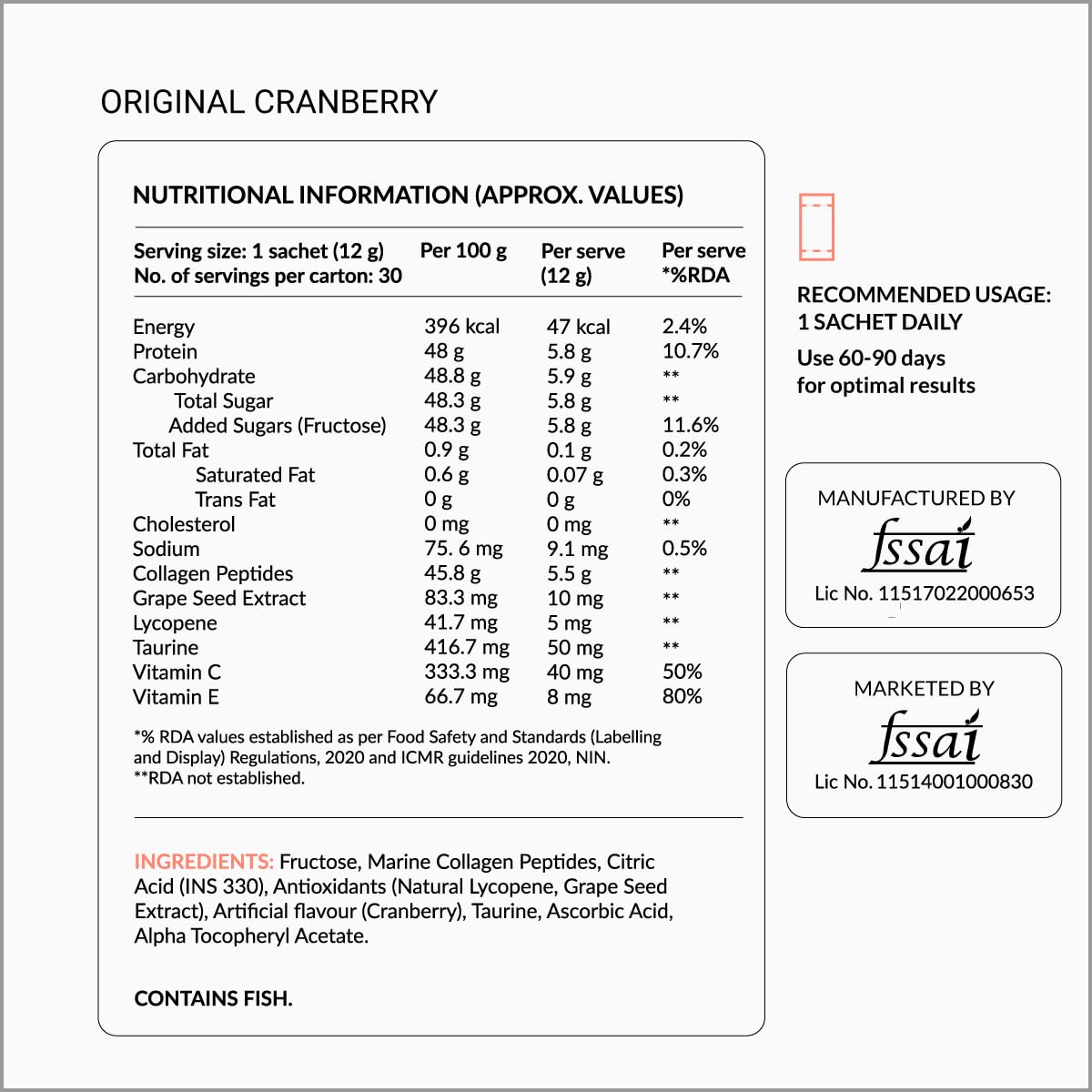 HOW IT WORKS: Our formulation contains hydrolyzed collagen with smaller chains of collagen that the body can easily absorb and use. Along with the other skin-healthy nutrients, it comes in a powder form (in sachets) that can be easily mixed into water. It has a cranberry flavour, contains no artificial sweeteners and is tested for heavy metals.