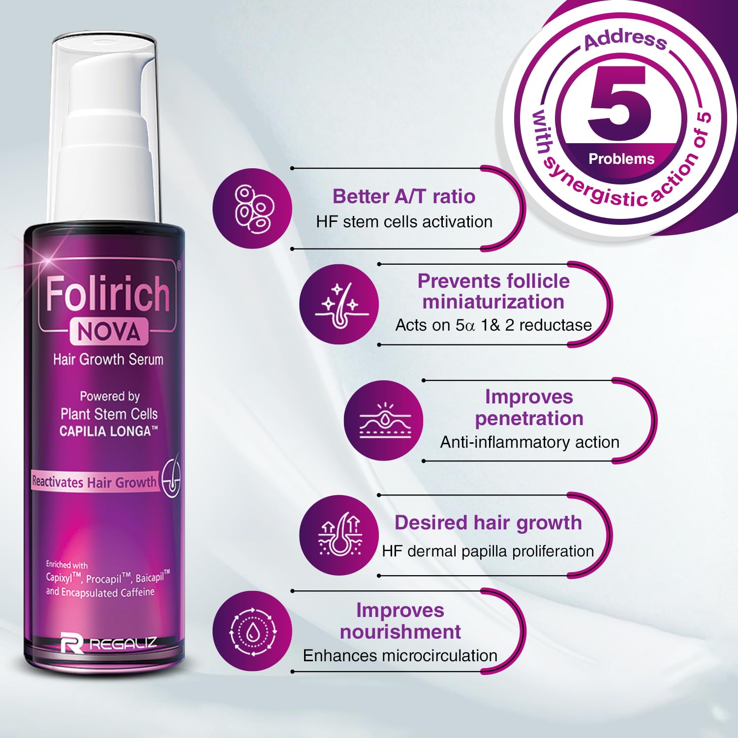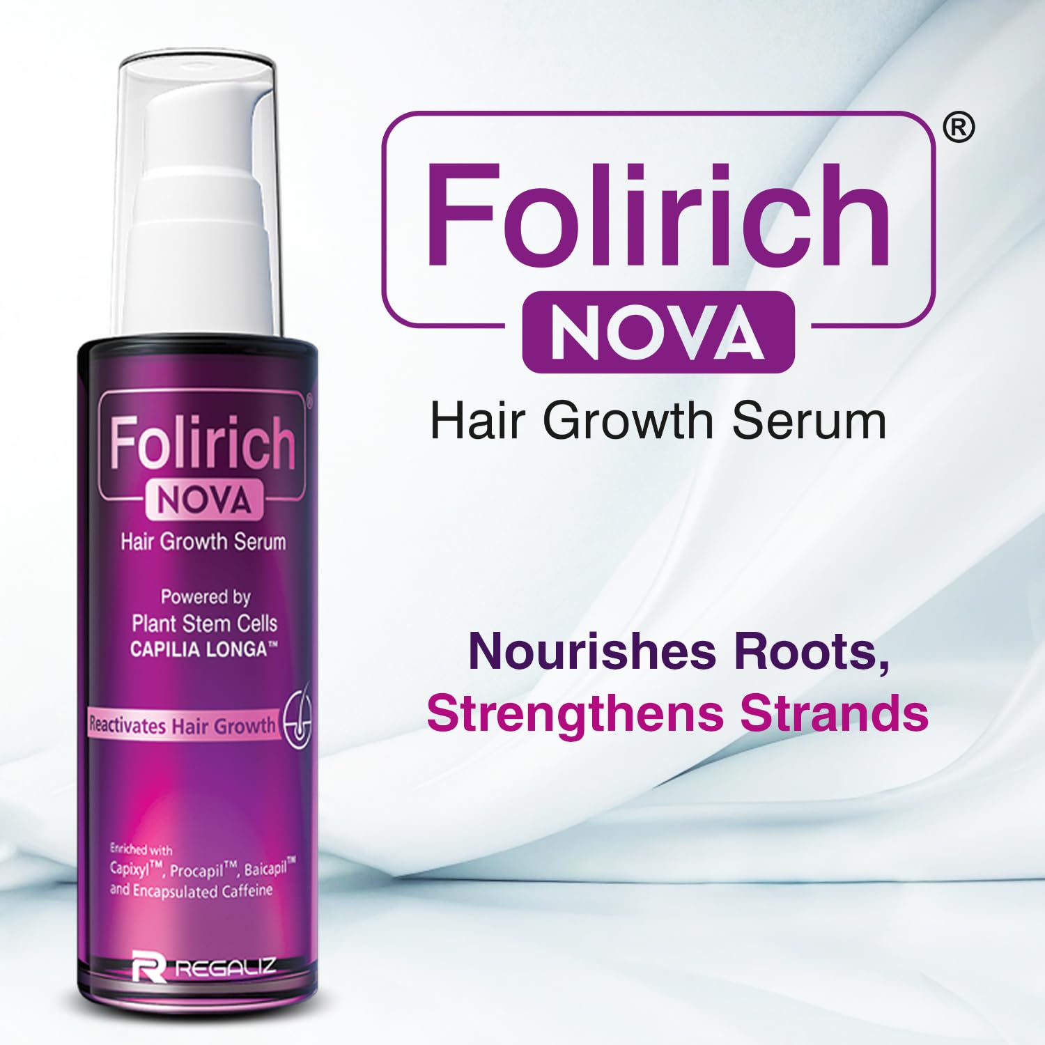 Regaliz Folirich Nova Hair Serum is a premium hair strengthening serum designed to nourish the scalp and hair strands. Enriched with Capilia Longa (Plant Stem Cell Extract), Capixyl, Procapil, Baicapil, and Encapsulated Caffeine, this lightweight formula supports stronger-looking, nourished hair while keeping the scalp healthy. Developed with NEOCULAR Technology, the serum absorbs quickly without leaving a sticky residue, making it suitable for daily use. The aesthetic glass bottle preserves the quality of active ingredients and adds a premium touch to your hair care routine. Suitable for all hair types and for both men and women, Folirich Nova Hair Serum helps maintain healthy, nourished, and resilient hair.