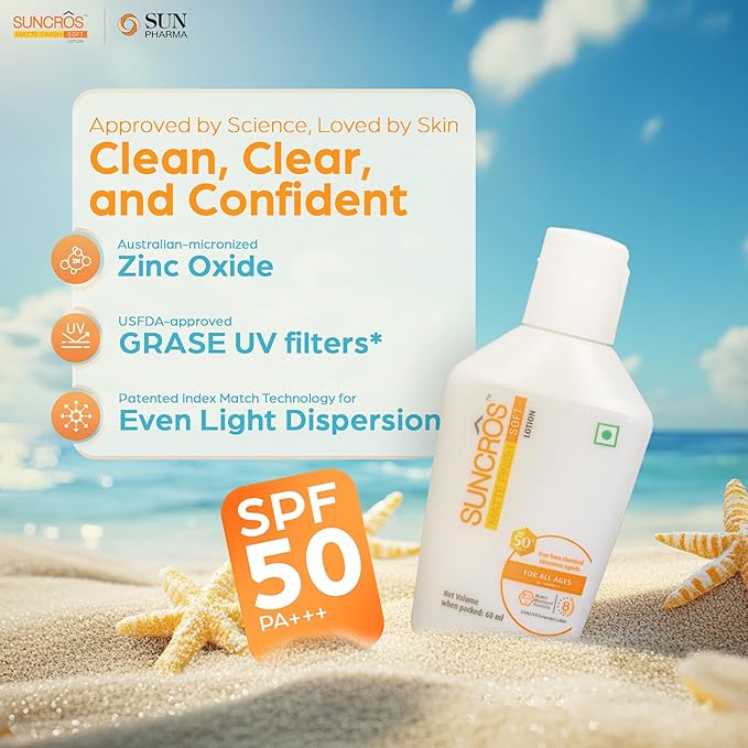 Dermatologist-Recommended – Sunpharma Suncros Matte Finish Soft lotion is a dermatologist-tested, mineral sunscreen powered by Zinc Clear technology. With SPF 50+ and PA+++, it offers high UVA/UVB protection ideal for acne, melasma, and post-procedure application.